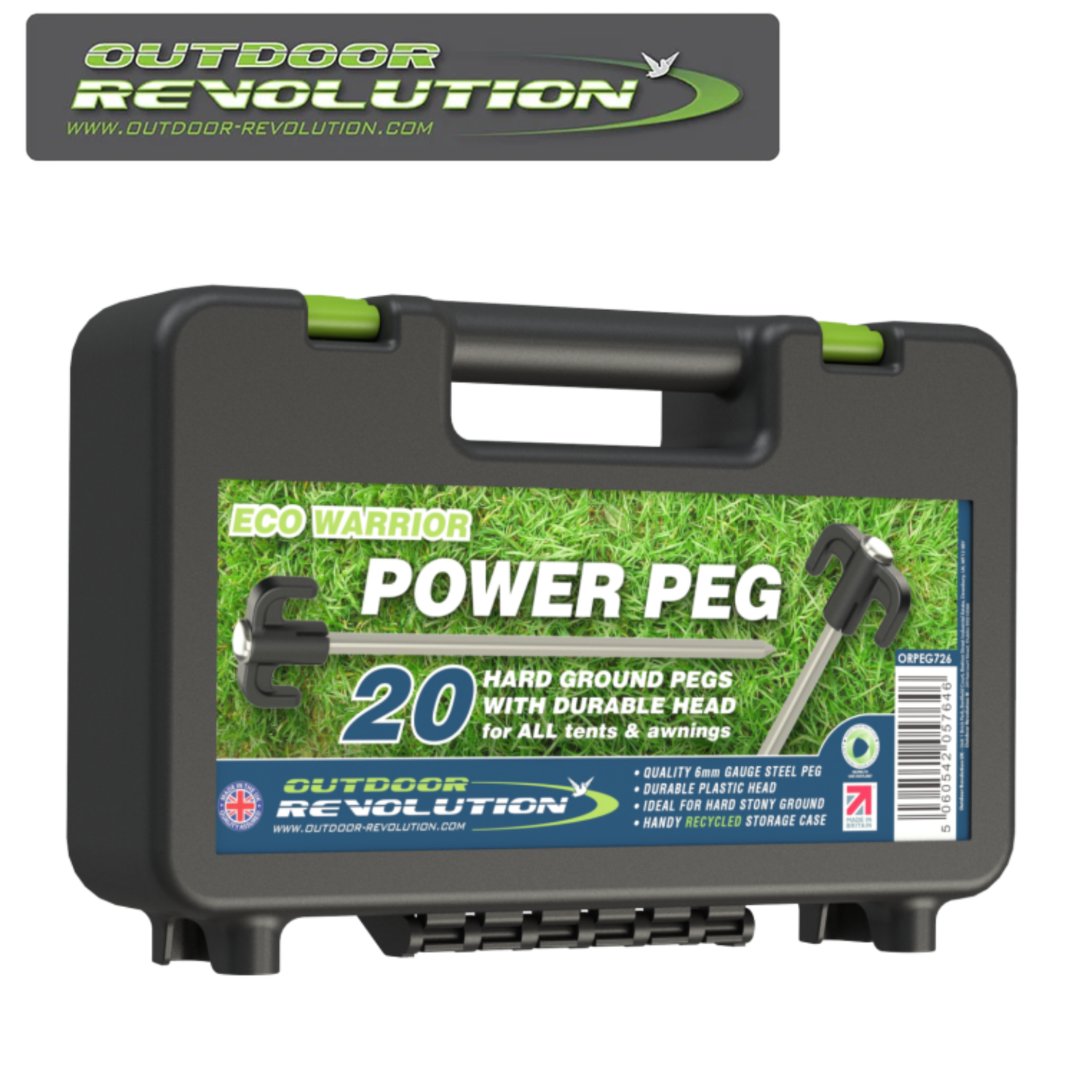 Outdoor Revolution Eco Warrior Power Peg is a tent & awning peg ideal for hard or stoney ground. Manufactured in the UK from quality 6mm gauge steel and plastic which is responsibly sourced from recycled materials for the peg heads and the plastic storage case. The handy storage case contains 20 Power Pegs.